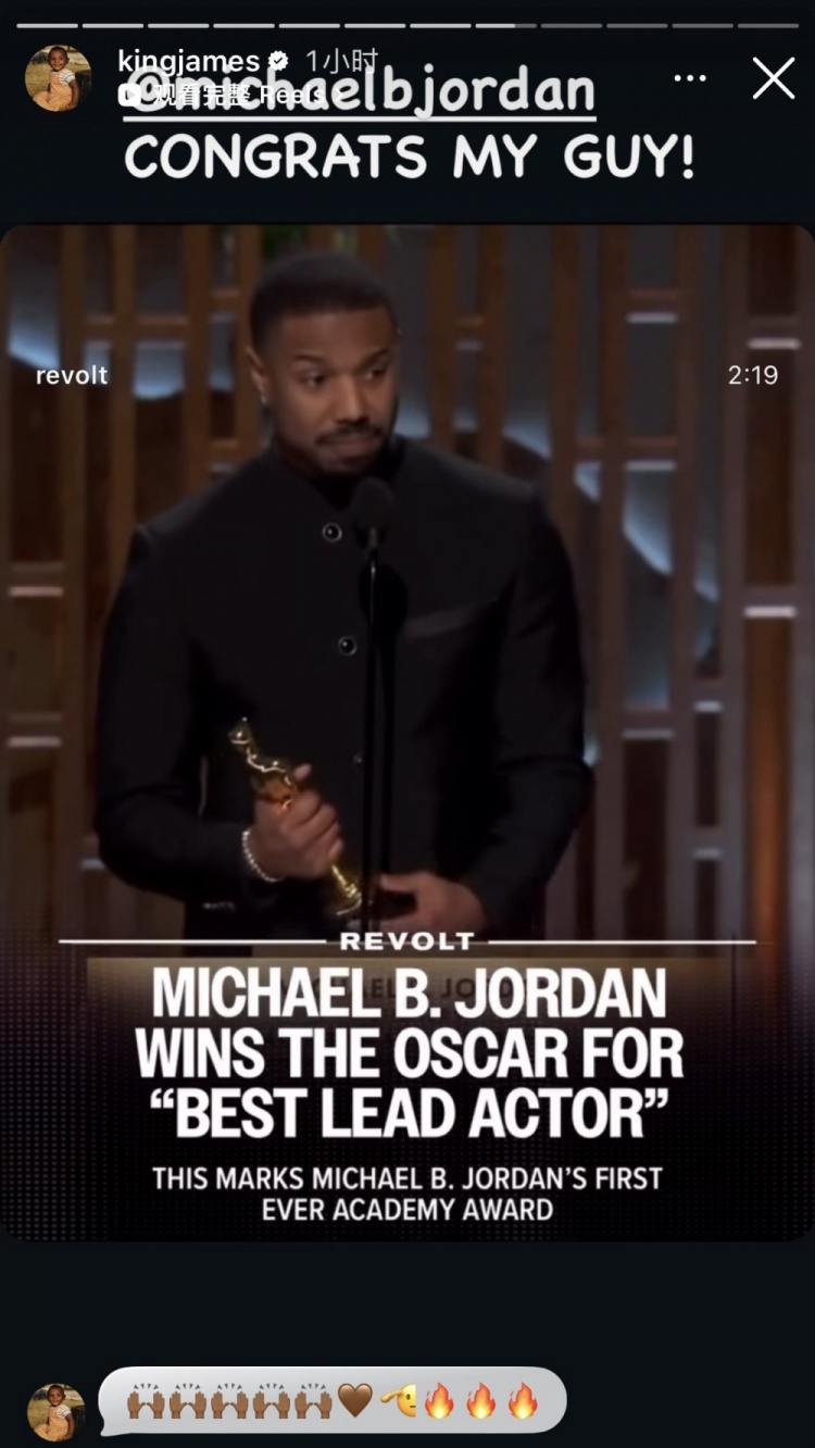 湖人球星詹姆斯更新Instagram Story转发迈克尔·B·乔丹的获奖片段表示祝贺:“@迈克尔·B·乔丹 恭喜我的兄弟!🙌🏾🙌🏾🙌🏾🙌🏾🙌🏾🤎🫡🔥🔥🔥”