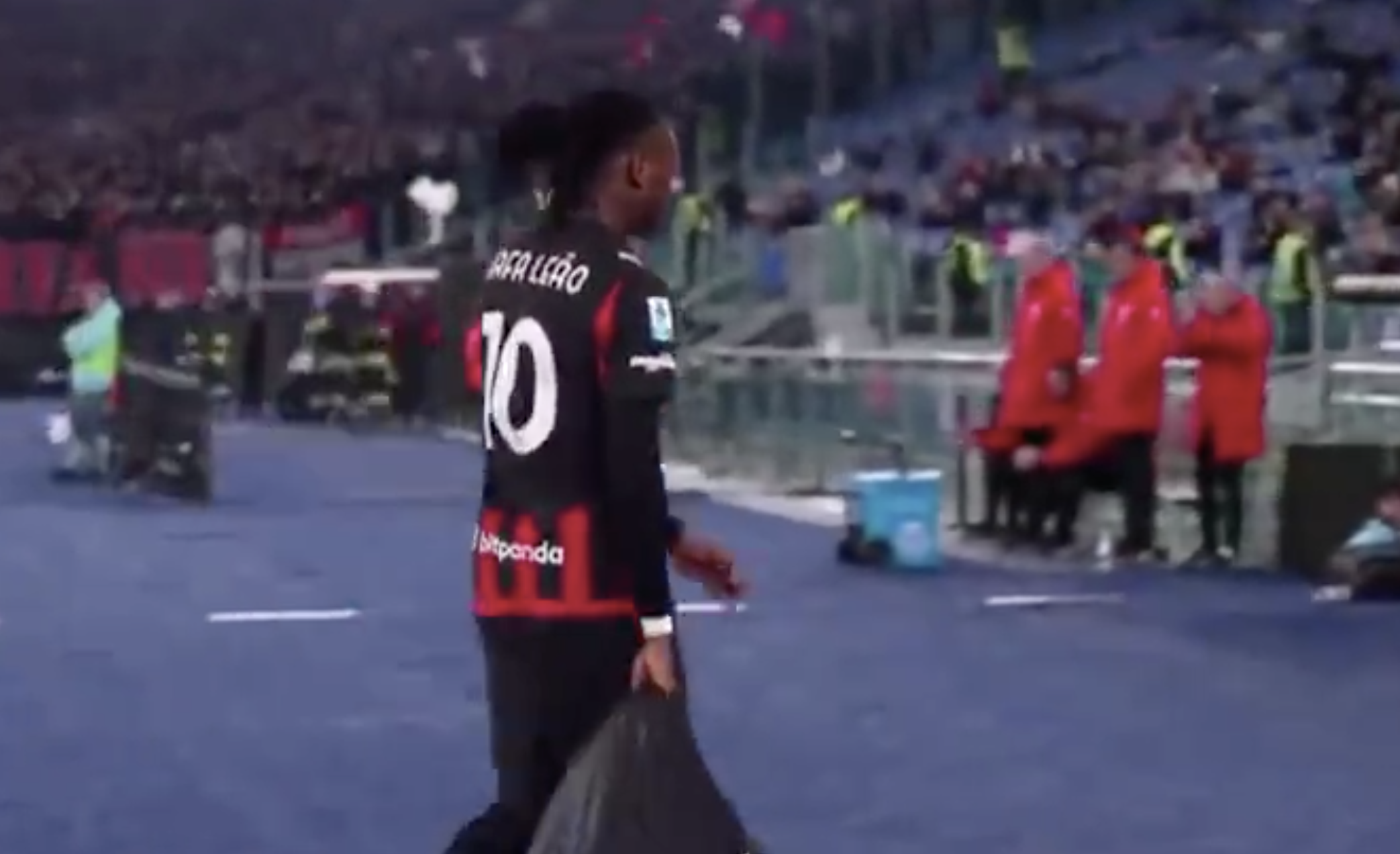 阿莱格里试图拥抱莱奥,想让他冷静下来。但是,莱奥并不领情,一把将阿莱格里推开,后者因此很是尴尬。最后,阿莱格里不再管他,继续关注比赛。莱奥此役出场67分钟,射门2次射正1次,没有成功过人,也没有关键传球,评分仅6.3分,他根本没有发火的理由。