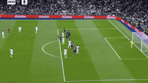 第39分钟,皇马获得任意球,维尼修斯一拨,巴尔韦德标志性起脚怒射,门将将球扑出,皮球来到吕迪格身前,德国后卫不停球撩射,打破僵局。